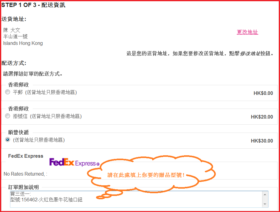 春季優惠:全場袖口鈕買三送一! 由2月17日至4月30日,凡購買任何袖口鈕三對,即可額外獲贈多一對 (贈品的價錢必須低於或等於訂單中最低價錢的一對袖口鈕)。 優惠不設購買上限,顧客並亦可購買多件相同貨品。多買多送,只需購物件數必須是三的倍數即可享受優惠。顧客必須在訂單附加說明欄填上贈品資料(請參考下圖),若顧客結帳時未有在備註中列明,我們將自動為顧客挑選其中一對袖口鈕並進行付運,恕不另行通知。